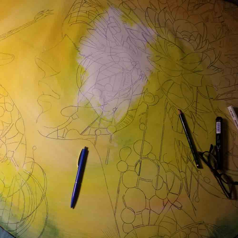Die ersten Linien sind gesetzt, und langsam formt sich ein Geflecht aus Formen, Wegen, Wiederholungen. Auf dem Untergrund liegt ein warmes Gelb, das sich stellenweise ins Grüne zieht – wie Licht, das sich tastend über eine Landschaft legt.
